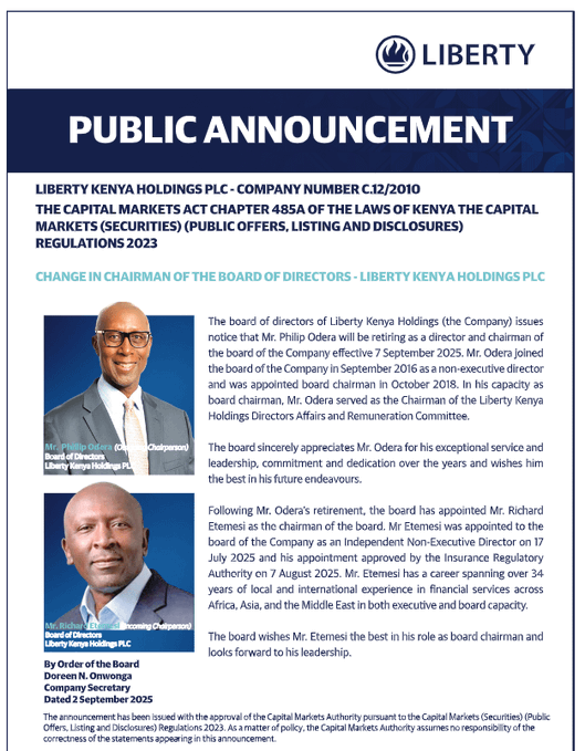 Liberty Kenya Holdings PLC has announced a major leadership transition with the retirement of its long serving chairman, Phillip Odera, effective September 7, 2025. The company made the announcement through a public notice on Tuesday, confirming that Mr Odera will step down from both his role as a director and chairman of the board.